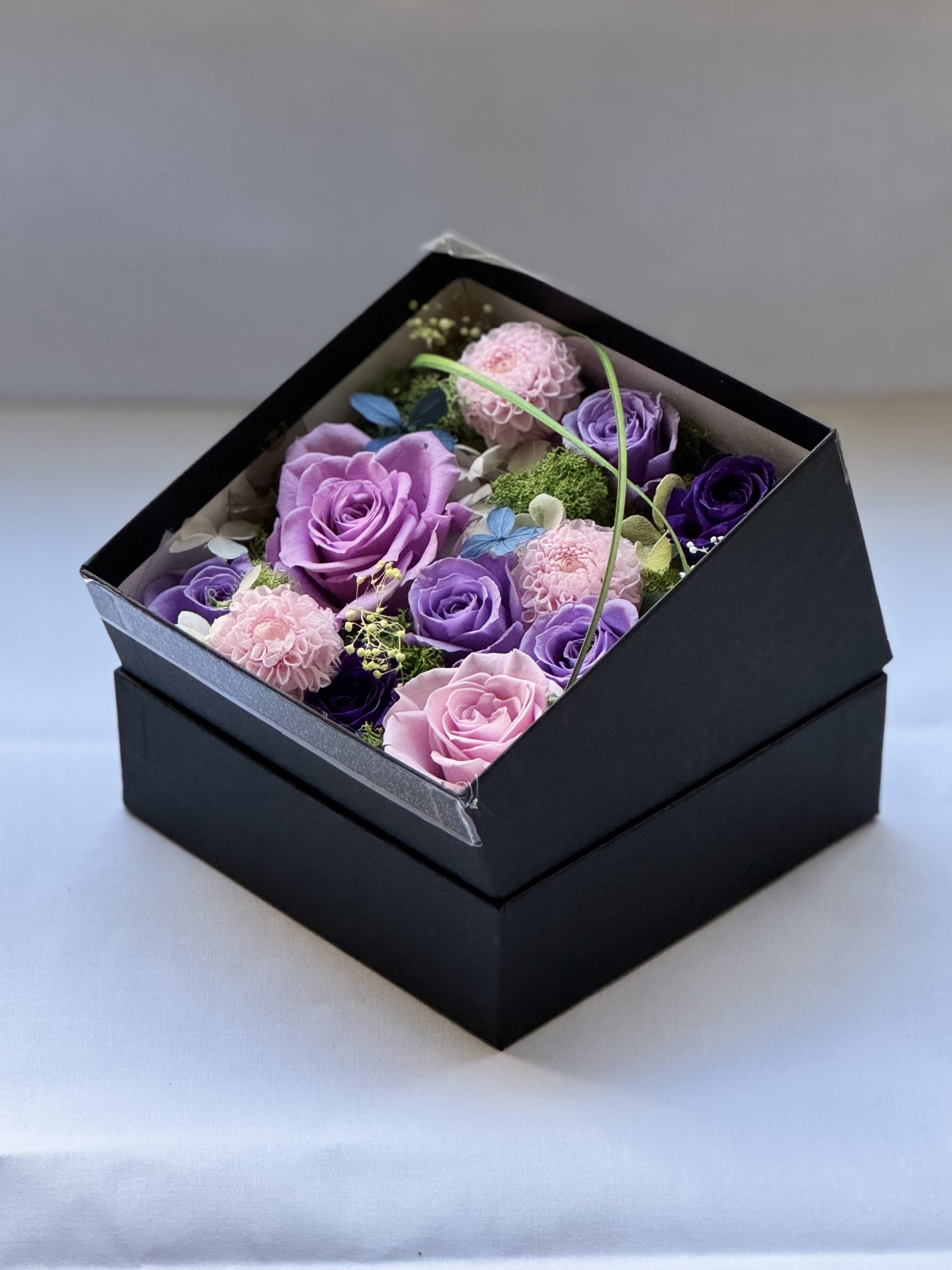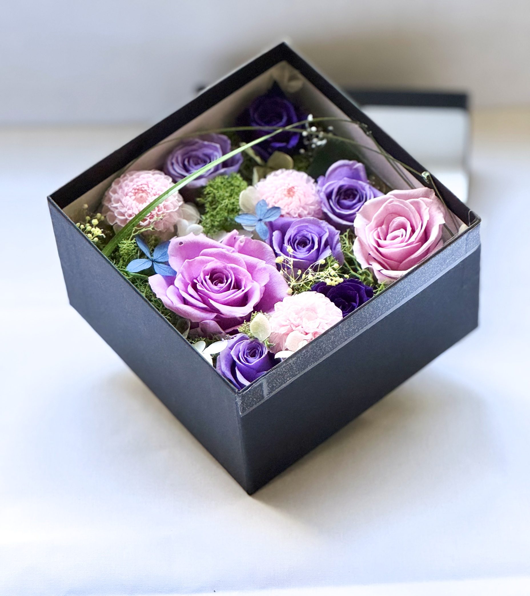 ボックスの中にバラや菊のお花がアレンジされています。
